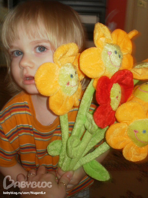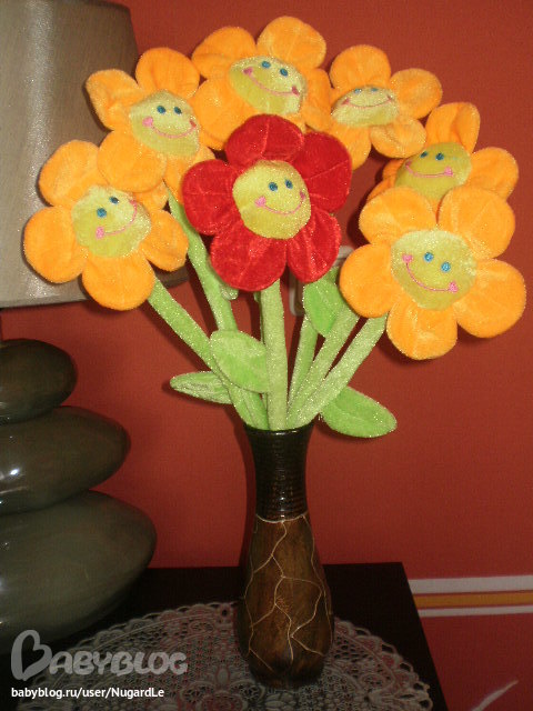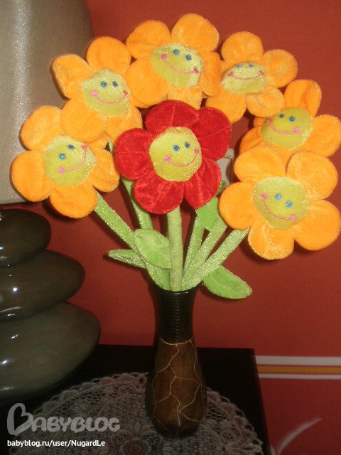 ПодаркиРешили мы с мужем , в этом году , не дарить букеты и вазоны из живых цветов , которые со временем увядают и засыхают ... ((( , а подарить букеты из мягких цветочков !!!