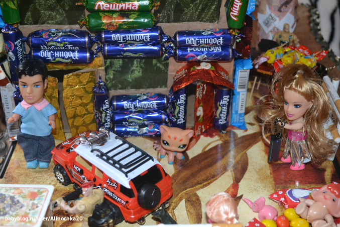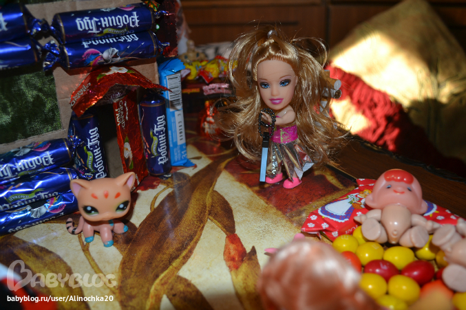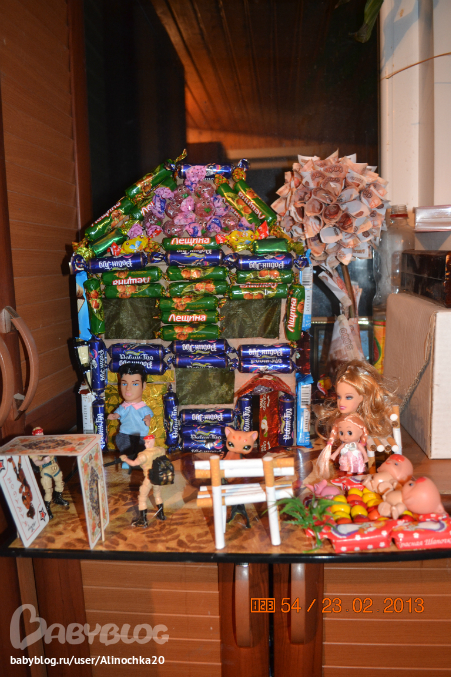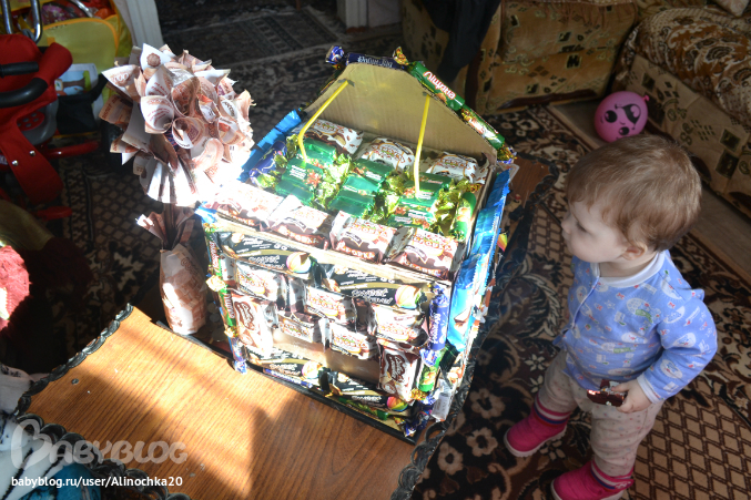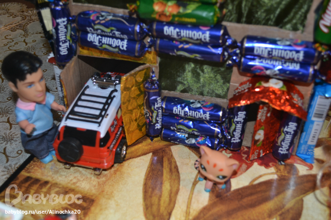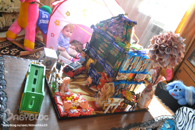 Если бы не Миланка я бы сделала этот домик гораздо раньше но она постоянно мешала! И покушалась на него! После того как наш папа его оценил я разрешила ей оторвать конфетку, она оторвала сразу 2=)))))) Хулиганка!