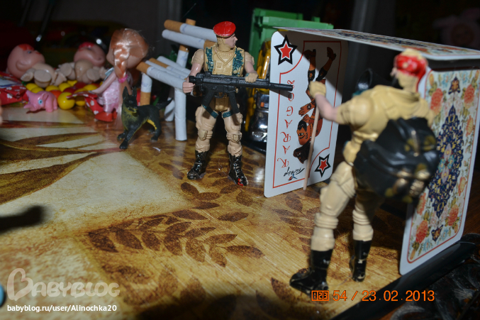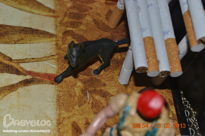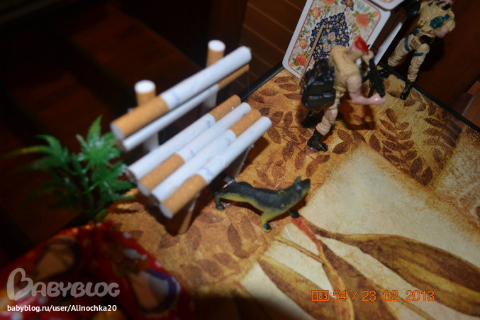 Собаку маленькую вобще не нашла, она мне с солдатами попалась. А кошка получилась больше собаки, меньше не было, только в комплекте с другими куклами типа БРАТЦ но я не стала из за кошки покупать. Вся "конструкция" стоит на картонной картине (она у меня со времен учебы в Воронеже валялась и вот пригодилась). Еще должен был быть забор но места на картине и так было мало поэтому сделала только ворота и то в последний момент.