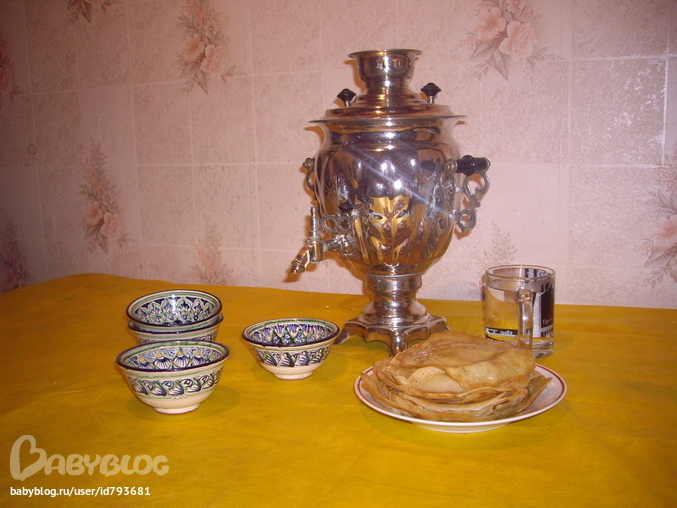 у нас самовар в детстве такой же был, один в один, теперь просто на холодильнике стоит, украшает кухню у родителей! а кисешечки-пиаточки такие нам летом подарили в Казахстане, они же ручной работы, да? ну и блины, как раз сегодня пекла и именно такие у меня получились они )))) вот жеж картинка-то! ))))