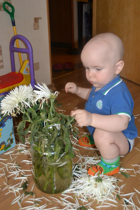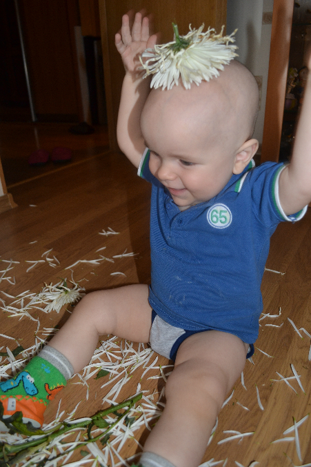 Очень смешные фото последние: как он серьезно "разобрался" с хризантемами))) Сразу виден основательный подход к делу, по лепесточку, чтоб ничего не упустить:)