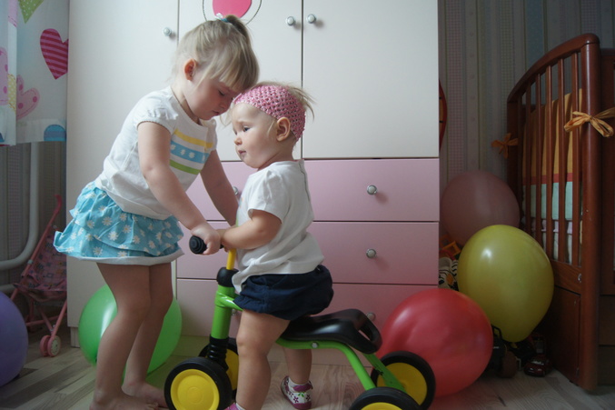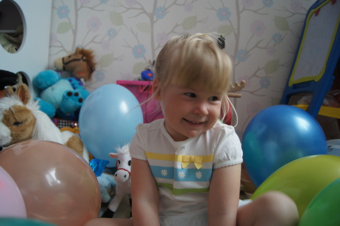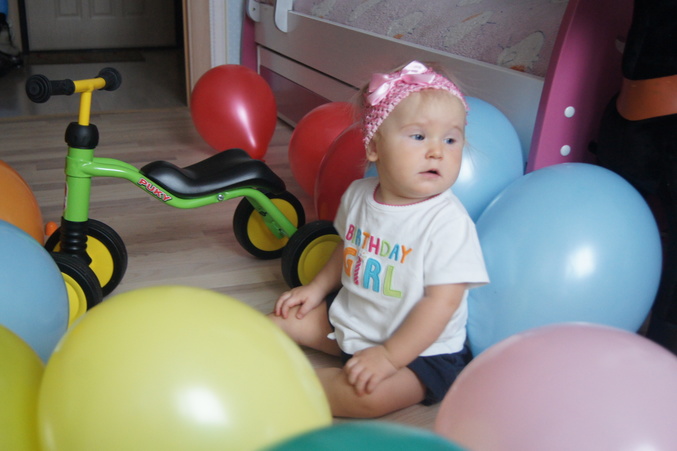 В первый день ничего особенного не было... В ночь надула шарики обычные, накидала их в комнату и закопала в них беговел (наш подарок).