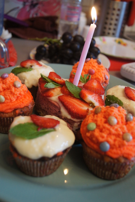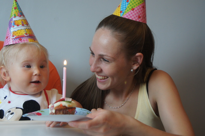 Ну и потом пошли задувать свечку, пока именинница не заснула! Я решила не заказывать в этот раз торт и не покупать, так как всеравно всяких там героев и прочее Саша еще не поймет..а я покрайней мере знаю из чего я готовлю и в этот день сделала капкейки для детей с малиной и творогом, а для взросой части (т.е. нас) терамису.