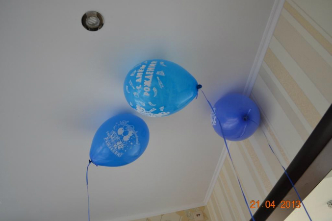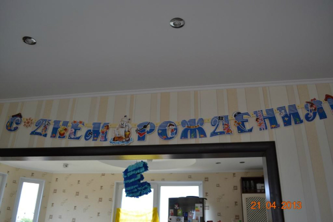 Для начала я (Муж помогал и дочка клеяла) сделала Пиньяту))) ох и не просто это оказалось, скажу я вам)))) Снизу ентого чуда была веревочка, за которую именниник дернул и на его голову бедную оттуда вылетели конфеты чем его довели до слез, тк он жутко испугался. Висела на люстре на кухне. Для гостей была развлекуха - задавался вопрос: Что это? кто отвечал буква Е, кто жопу увидел, кто букву З))))))))))))))Тройку не увидел никто)))))))