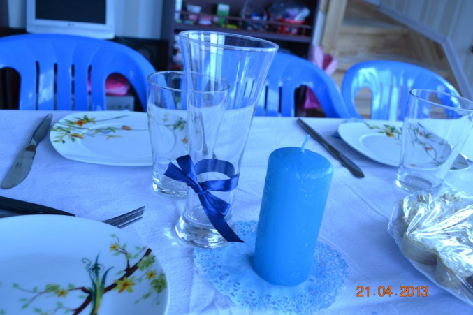 получилось мило. жалею не хватило денег на синюю скатерть))) и хотела прикупить синие стеклянные бокалы.