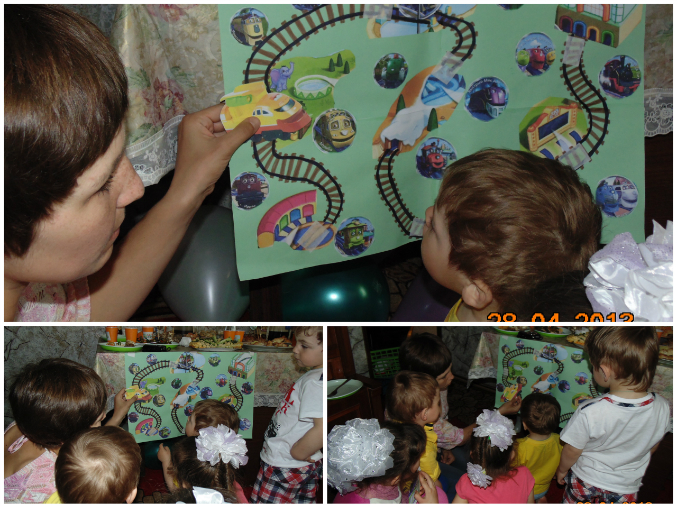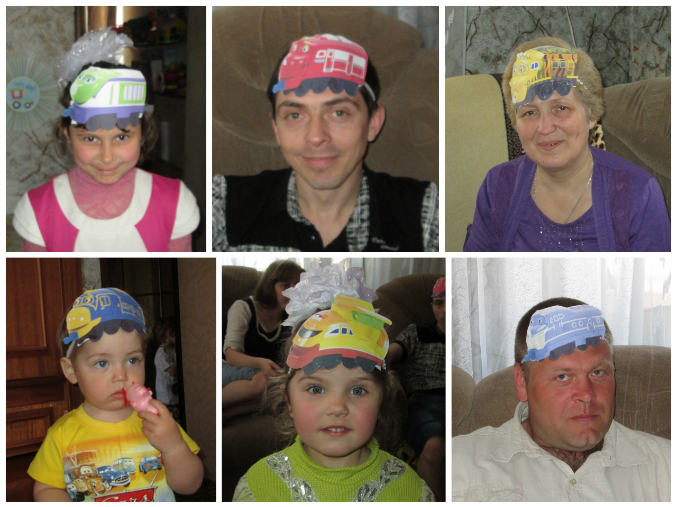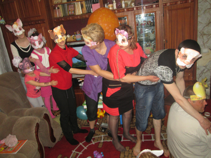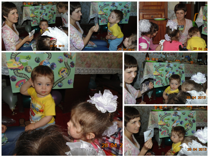 В начале гостям были вручены паровозики. Именинник отказался его надевать. Он вообще в обществе других детей ведет себя по другому, не так как с близкими, поэтому некоторые задумки, которые на мой взгляд должны были его заинтересовать, остались не востребованными. Ну да ладно. Больше всех проявляли интерес ко всему происходящему девочки и Паша, наш младший)))