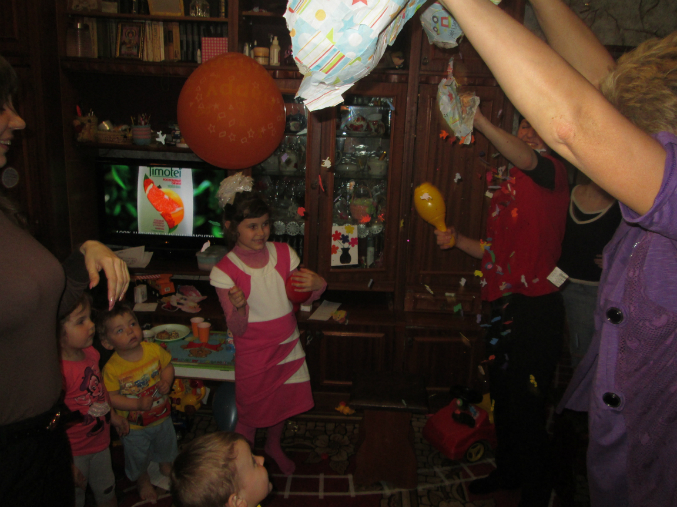 Сначала дали детям отвести душу. Ух, как пиньяте досталось! Но силенок все равно не хватило и пиньята только помялась.