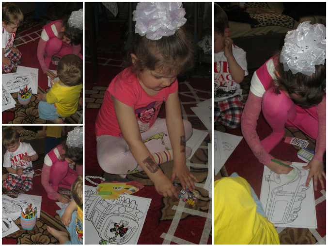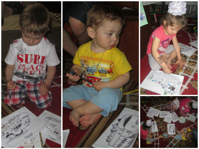 Дальше нам на пути попался малярный выгон. Ой, сколько паровозиков нужно украсить! С помощью карандашей и наклеек дети справились с заданием.