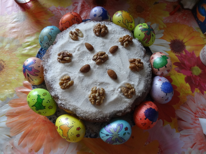 Вот такой я испекла куличик и разукрасила яички))) Так жалко их было кушать)))
