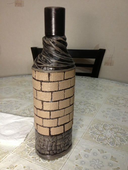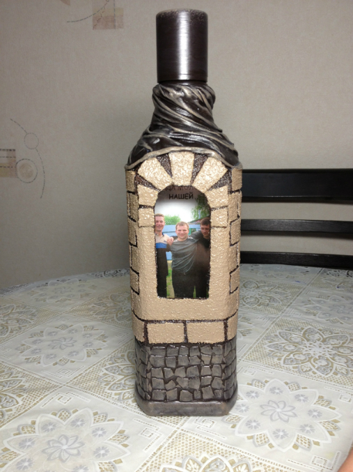 Вторая - крепость (картон, яичная скорлупа, чулок, манка, акриловые краски, лак). Рисунок просматривается сквозь напиток - он приклеен к задней стороне бутылки. Если повертеть бутылку можно рассмотреть весь рисунок.