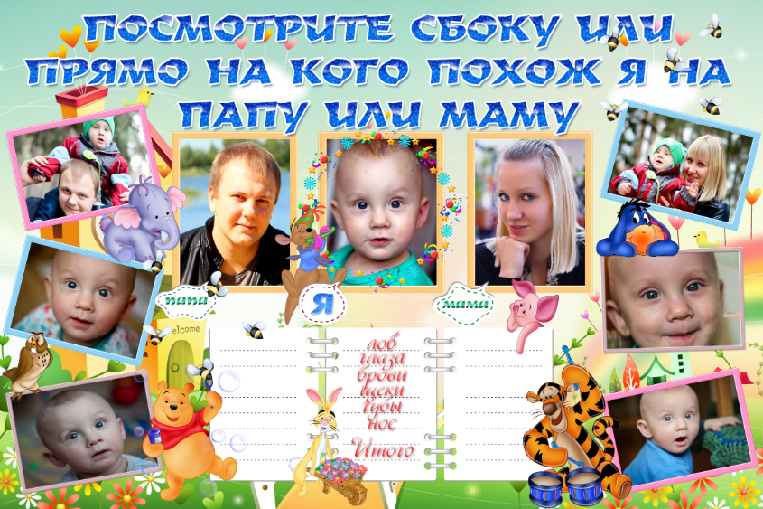 - Проставить на плакате "На кого похож" галочки за маму или папу
