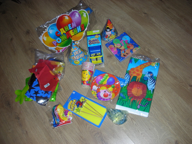 Дальше стала закупать и готовить оформление. Накупила в Затее вот такого веселья: скатерть, салфетки, тарелочки и стаканчики, колпачки взрослые и детские, гирлянда ввиде торта с ДР, свечки на палочках - двойка и две звезды, фольгированные шарики - ракета с ДР, крокодил с подарком (советских персонажей-шариков не нашла - купила просто зеленого крокодила), шарик с цифрой 2, обычные шарики (но для гелия). Баллон был куплен там же.