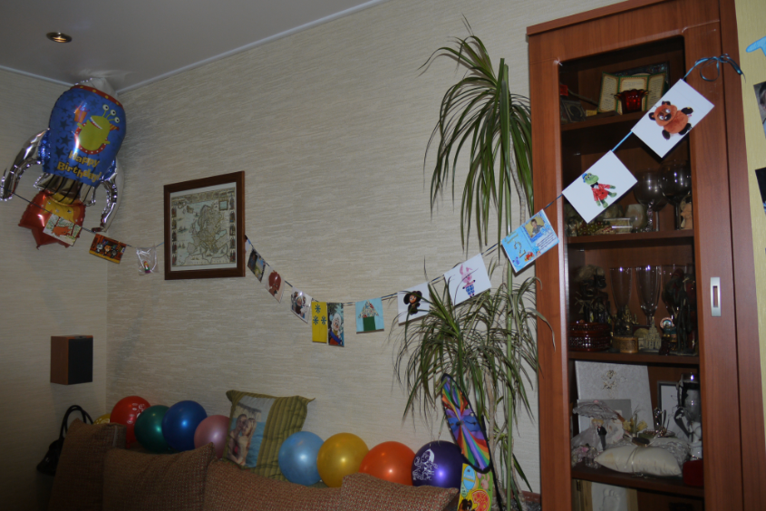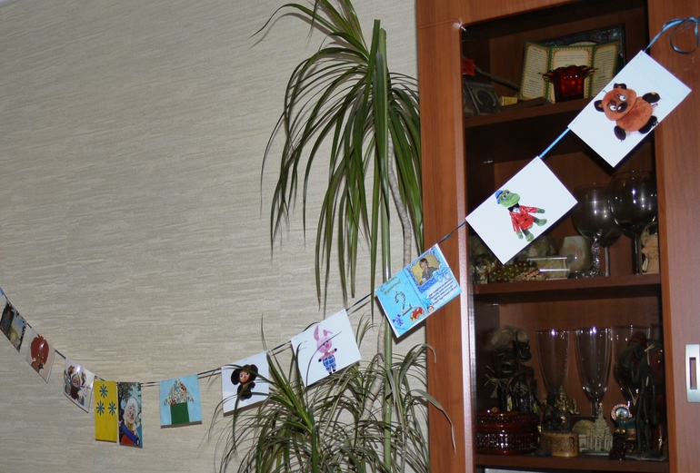 Сама сделала гирлянду: распечатала фотографии всех любимых персонажей (не только по тематике), купила атласную ленту, прикрепила на нее фото степплером. Еще на эту же гирлянду прикрепила работы сыночка из развивающего центра и несколько фото в рамках. Хотела крепить цветными прищепками, но забыла купить. И так смотрелось неплохо. Вот частичка гирлянды: