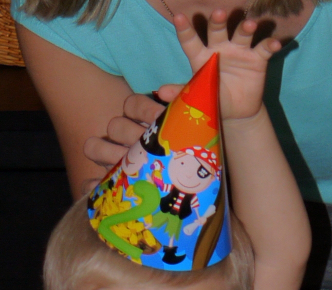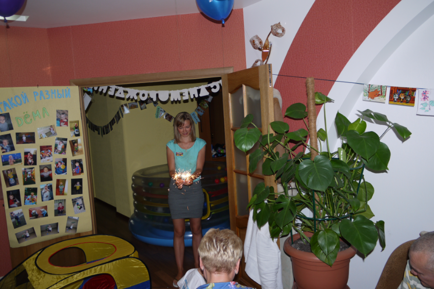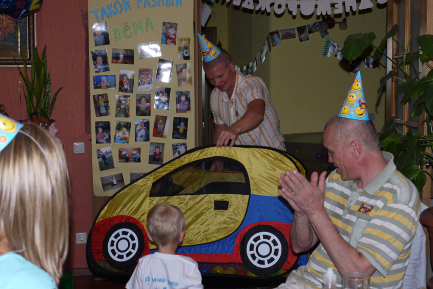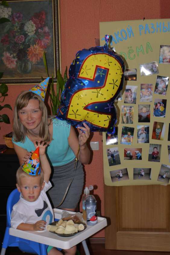 Все рассаживались, одевали колпаки и в первый день бейджи-наклейки "Демьяну 2 года".