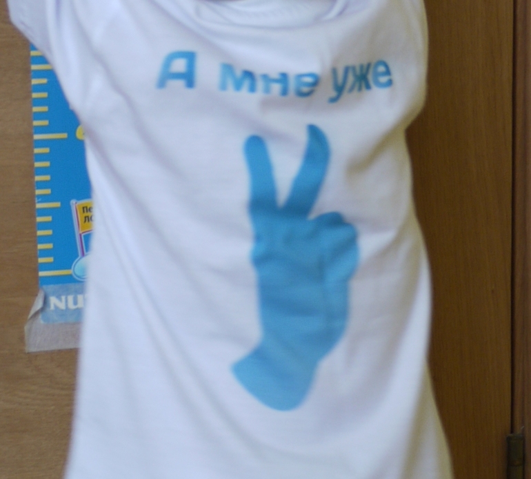 И наконец, наряд именника было решено делать как можно комфортнее - жарко и жалко (ребетенка в костюме:). Мы сделали на заказ футболку - надписи рисовала знакомая дизайнер. Шортики в тон и носочки уже имелись. На купленный детский колпачок наклеила вырезанную из бумаги цифру 2.