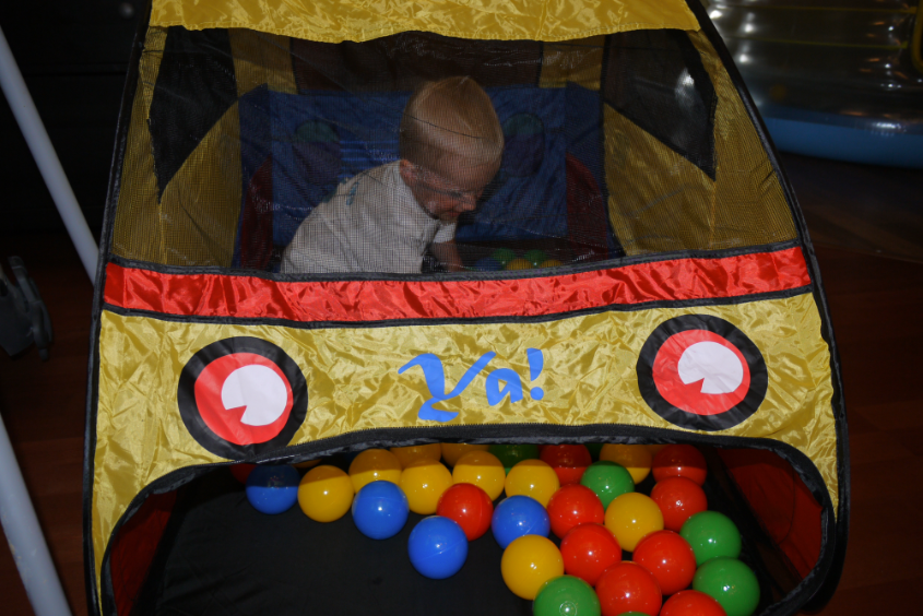 Вначале именинника посадили рядом с нами в десткий стул с накрытым столиком: фрукты, печеньки, напитки. Потом он носился и играл весь вечер.