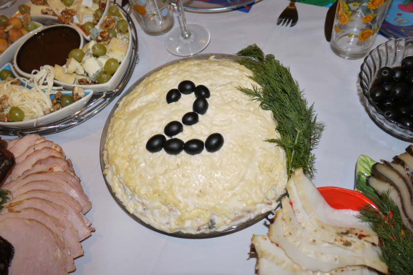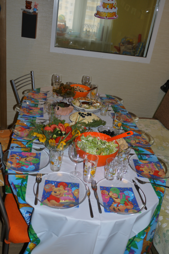 У взрослых все было насыщенно: первый серьезный тост и вручение "дерева", всеобщие слезы умиления. После этого дали возможность всем желающим высказаться. Ну а дальше понеслась:)) Показывали фильм, угадывали параметры именинника, играли в игры, конкурсы, вручали призы, слушали тосты, рассматривали подарки, фотографировались, ели, конечно же, и пили:) Честно скажу, меня стол волновал мало, я больше переживала, будет ли всем интересно и весело. В первый день отмечали у моих родителей дома, т.к. там можно было батут поставить. Там столом занималась мама. А вот второй день я все делала сама. Все были довольны:)