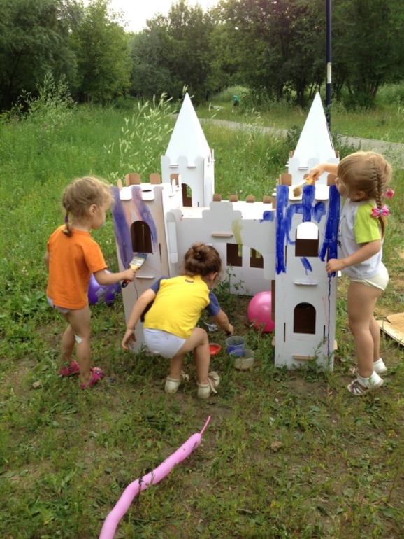 День рождения ДетскийХочу поделиться хорошей идеей для развлечения детей на природе. Вчера отмечали 3-х летие дочки. Накануне нам подарили картонный замок, который мы взяли с собой на природу. Собрали его, развели детям краски (хорошо смываемые), одели старые футболки, и дали детишкам кисти. Юные художники были очень увлечены раскрашиванием замка. Рекомендуем;)