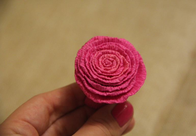 Край я загибала не очень плотно, закручивала плотно, т.к. длина полоски большая. Диаметр розочки получился 4,5см.