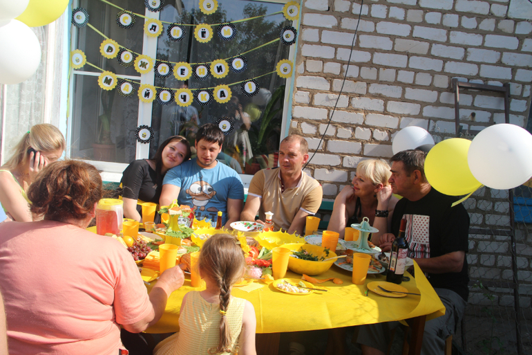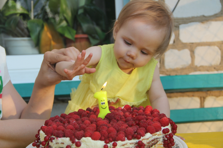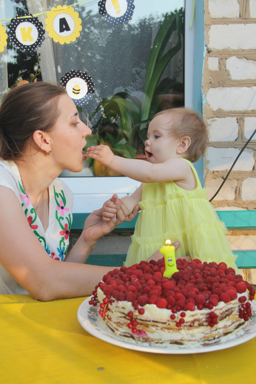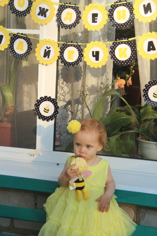 День рождения Детский12 июля у нас был двойной праздник. Наконец-то мы окрестили нашу доченьку. Так долго не получалось этого сделать. И отмечали ее годовасие. День рождения Майечки отмечали в стиле пчелки. Без каких-либо конкурсов. С ними бы я вообще померла. всю ночь готовила, все утро бегала, потом в церковь и за стол. К вечеру голова раскалывалась, но все прошло хорошо. Не все сделала, что хотела из декора, но не беда.