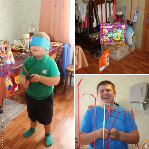 Для всех, в том числе и для взрослых на веревочку были привязаны небольшие призы и каждый по очереди с завязанными глазами должен был отрезать этот приз. Естественно именинник был первым...