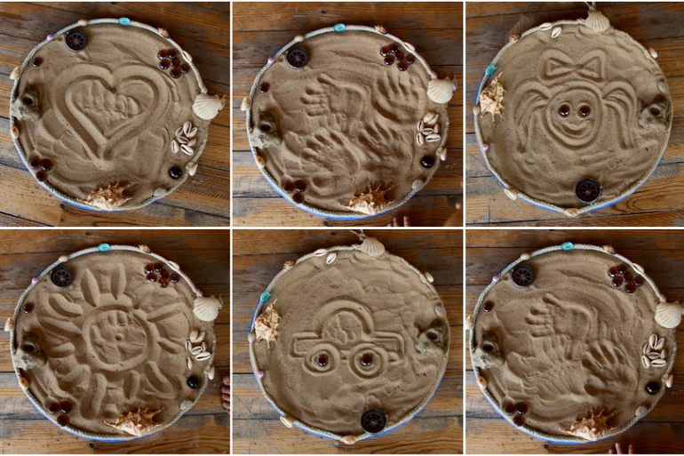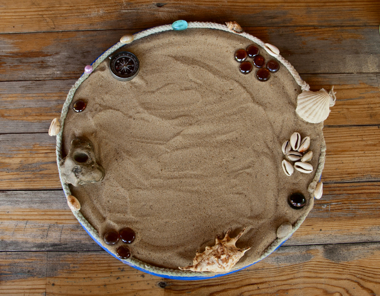 Пожелания имениннику все оставляли не стандартным способом, опять же в тематике праздника - на песке... Рисовали и фоткали. Кто что хочет, сердечко - любовь, солнышко - здоровье. Дети отпечатки рук оставляли - видимо много друзей будет... Ну еще машинку и подружку нарисовали... Вот такую штуку я сделала из крышки от бочки и оформила ее в морском стиле.