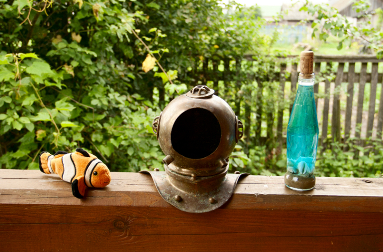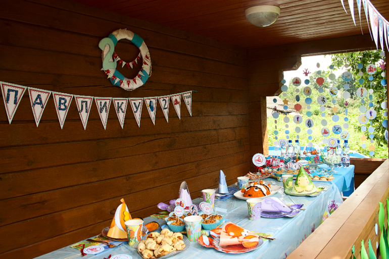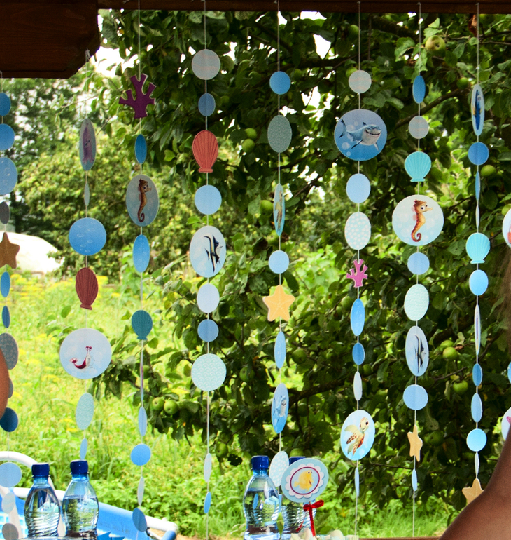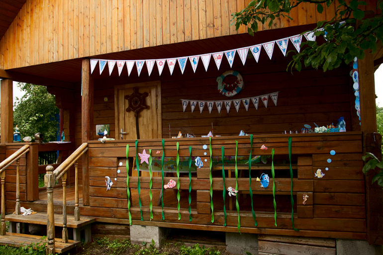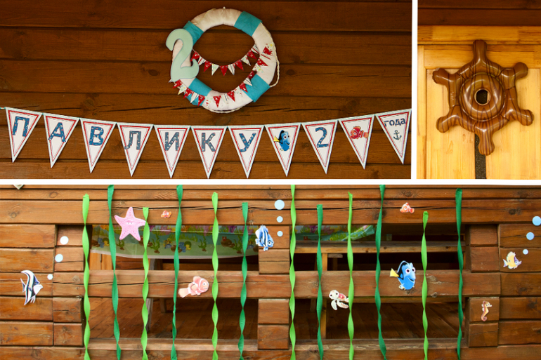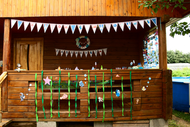 Веранда была украшена флажками в морском стиле. Внизу среди водорослей из креповой бумаги плавали рыбки персонажи из мультика. На перилах были раставлены разные вещи тоже на морскую тему...