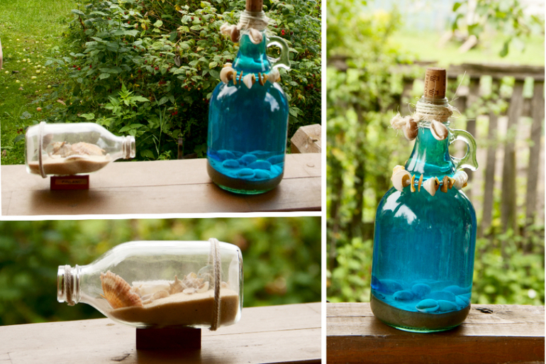 А это еще примеры нашего с детьми творчества при подготовке к ДР - делали море в бытылках. Сыночкам так нравилось насыпать песочек, кидать камушки, бусинки и ракушки, потом заливать подкрашенной водой, что бытылок сделали много. Под конец уже в простых пластиковых делали. Но для оформления взяла только приличные красивые стеклянные )))