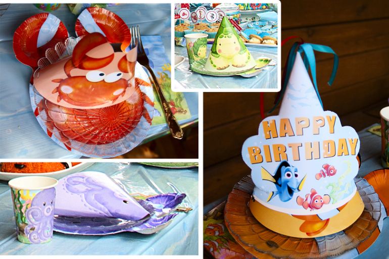 Стеклянные прозрачные тарелки были в виде ракушек, они стояли на тематических бумажных (хоть они и крепкие. все равно по моему пригодны только чтобы съесть с них кусок торта, не более, поэтому и поставила сверху стеклянные). Вместе с колпаками, салфетками получилось очень красиво, тем более что все были разные и гости выбирали кто кем будет, например китом или черепахой...