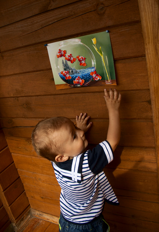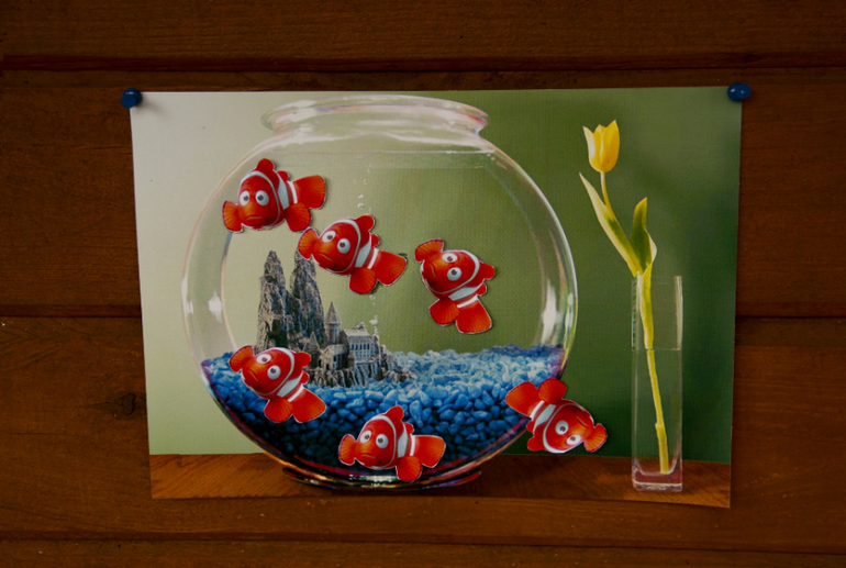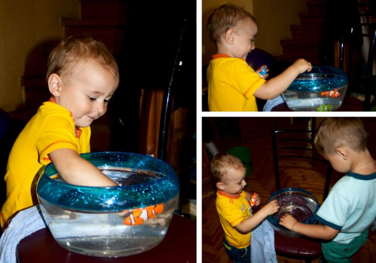 Конкурсы были такие: помоги Немо добраться до аквариума. Надо было с завязанными глазами наклеить рыбку, причем специально брала картинку где аквариум занимает только часть листа. Так как особо хитрые сначала на ощупь определяют где бумага на стене и только потом клеют... Но Павлик потом подошел в конце и всех рыбок поместил правильно, все исправил )))