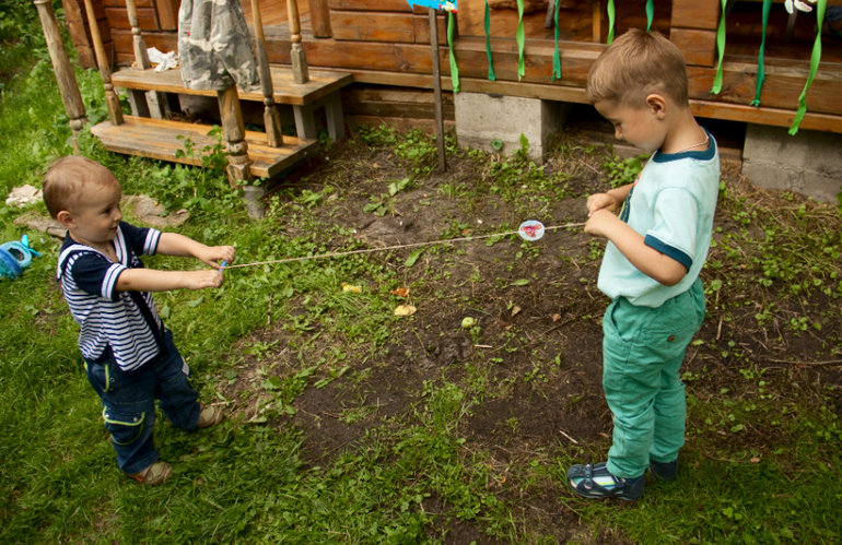 Еще было кто быстрее доберется до Немо - посередине веревки рыбка и кто быстрее намотает свой конец на карандаш. Ну конечно же Вовка не поддался и именинник проиграл...
