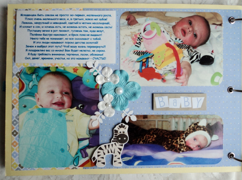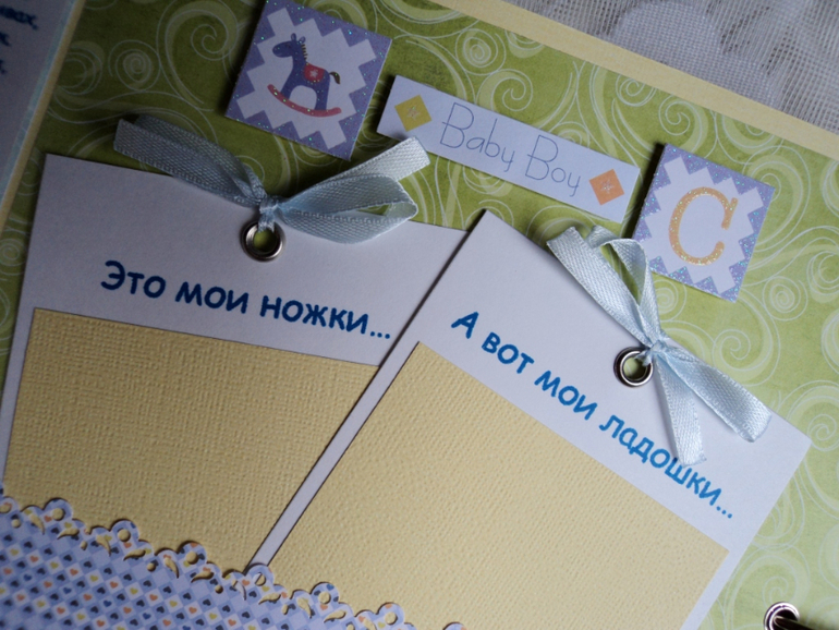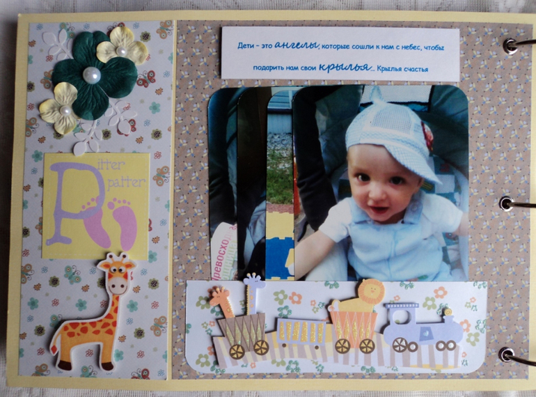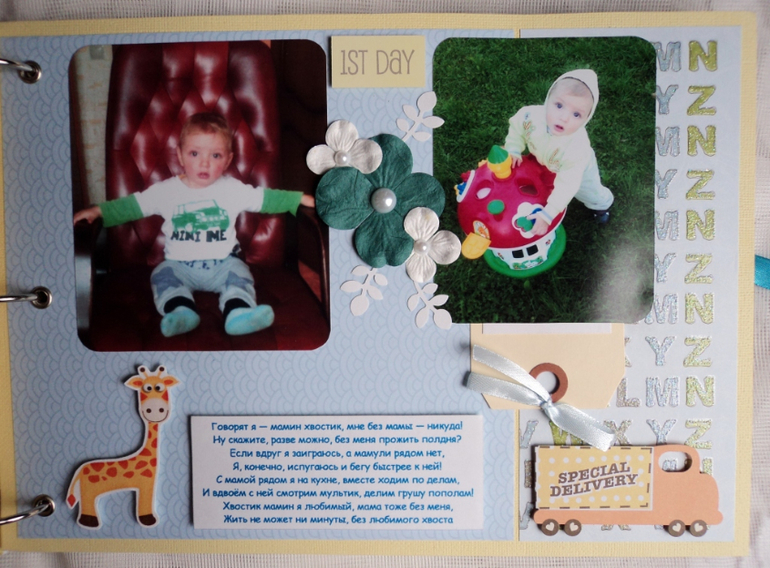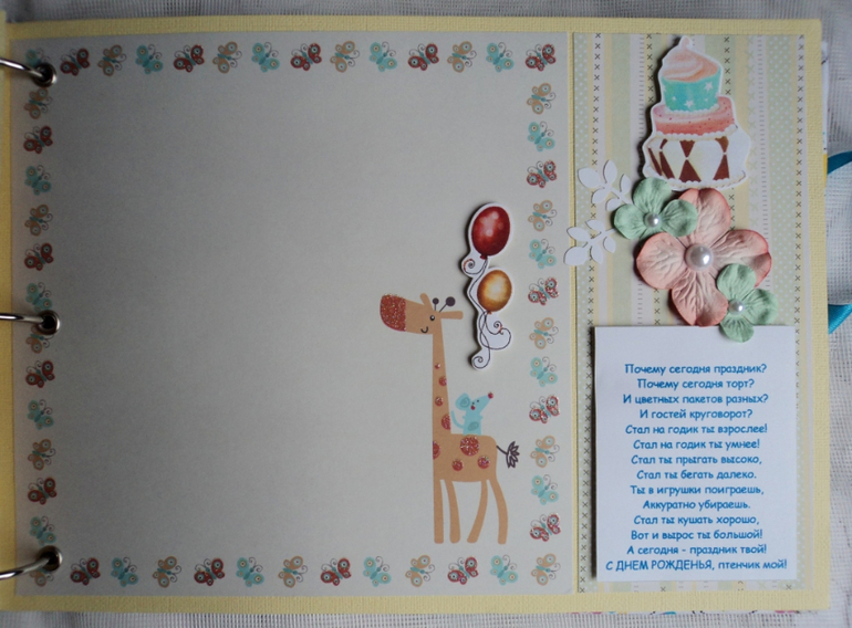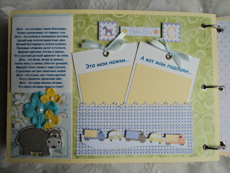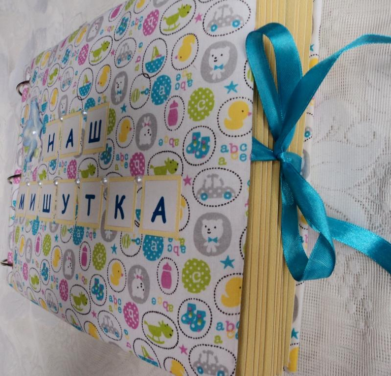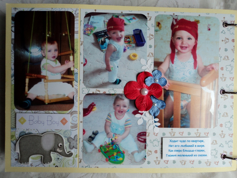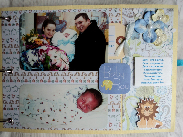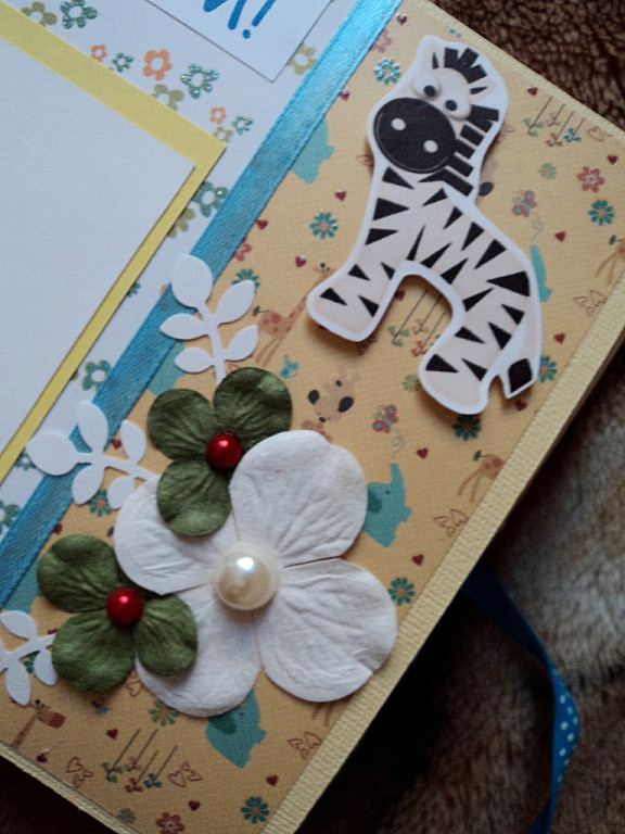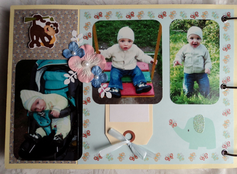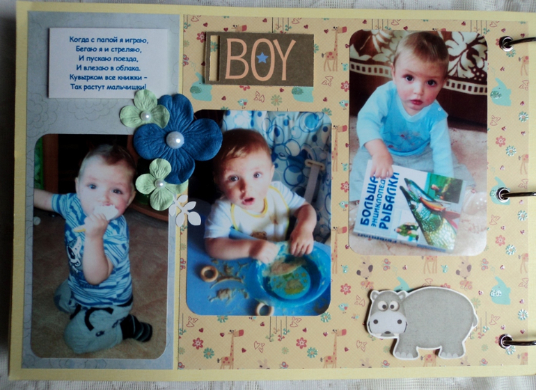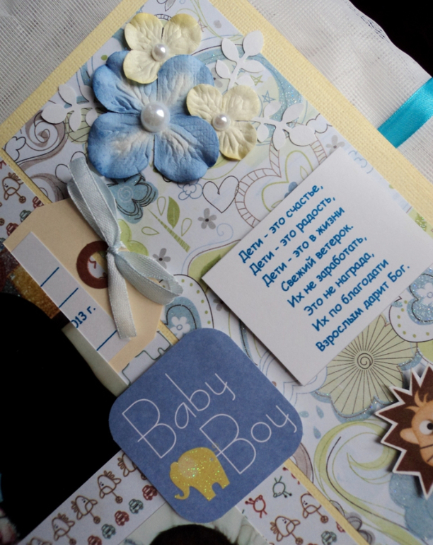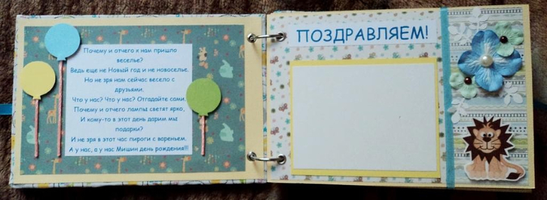 Весёлый и задорный комплект на День рождения мальчика. Альбом формата А4, 10 разворотов, мягкая тканевая обложка, вмещает много фото, есть бирочки для записей, кармашки, стихи. Книга пожеланий формата А5, мягкая тканевая обложка, 8 разворотов. На каждой страничке место для пожеланий, а в середине альбома разворот «На кого же я похож». На одной страничке - фото с папой, на второй - с мамой. Под фото вставлены тэги для записей, на которых гости будут писать чем Мишенька похож на папу и на маму). Книга дополнена украшениями - картинками «Зоопарк», цветами, жемчужинками. И коробочка для первого локона. Итак, смотрим... ООООчень много фото))))