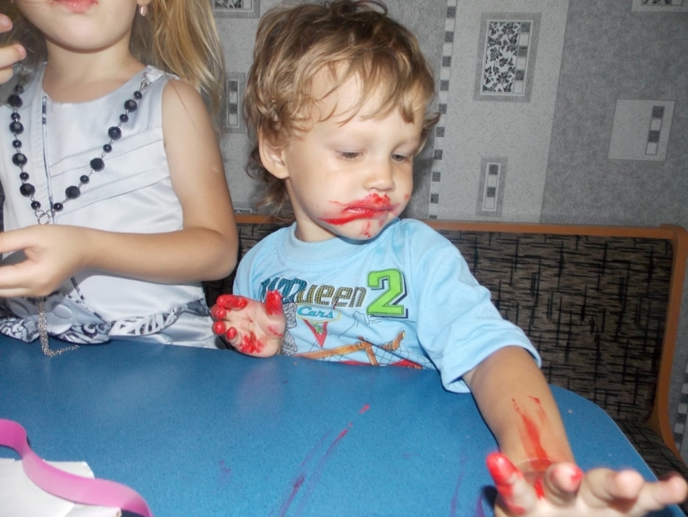 А потом мы посмотрели видеоролик из фотографий моего любимого мужчины, который несколкео дней подряд монтировали вместе с моим очень хорошим другом. Ролик получился забавный и трогательный, моя мама пустила слезу умиления, а Святка все время обнимал и нацеловывал меня, все понимает))) Потом ребятня возилась, носилась и воровала, подаренный папой, торт! Кстати, на нем был термоядерный краситель - изгваздались все, отмывалось и отстирывалось с большим трудом)))