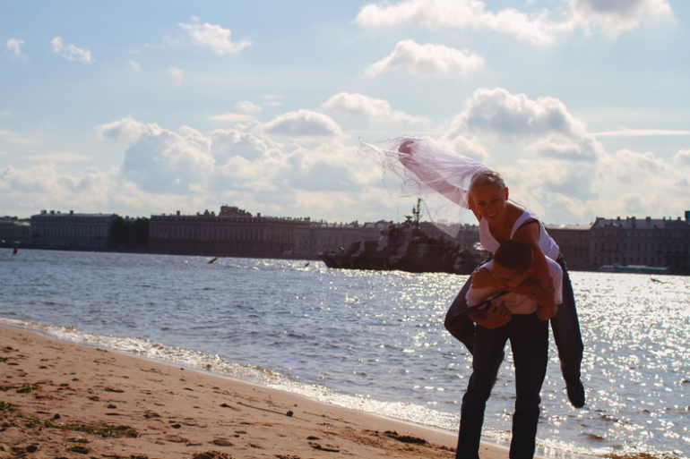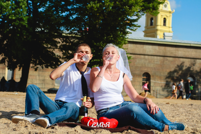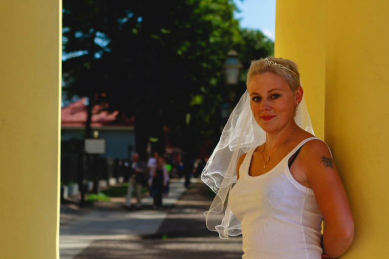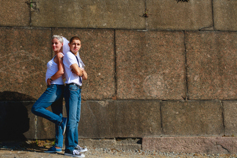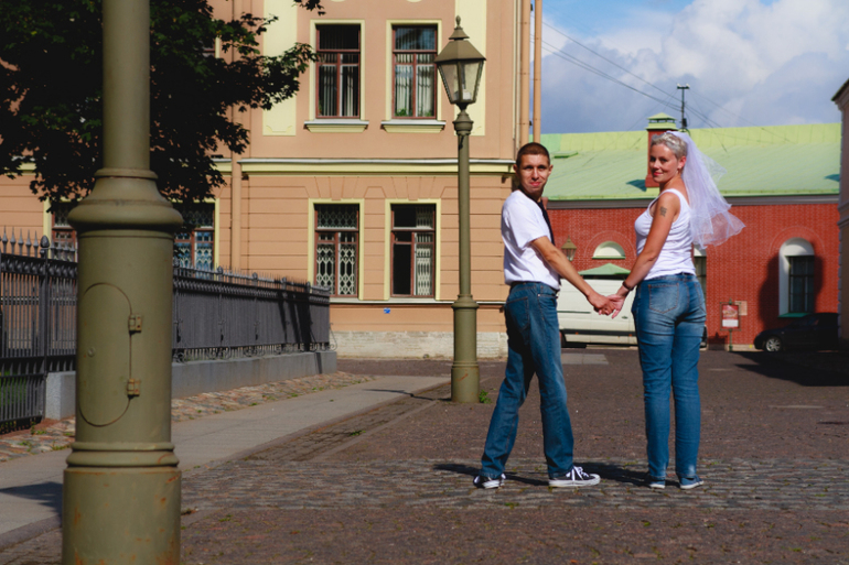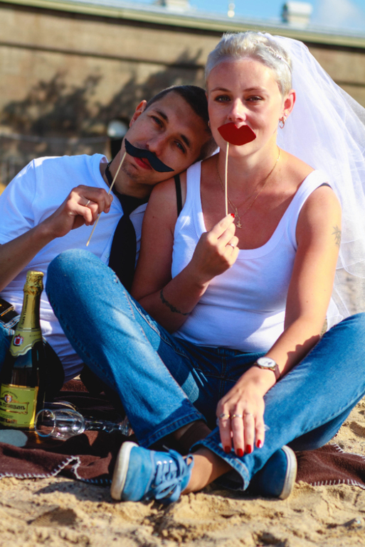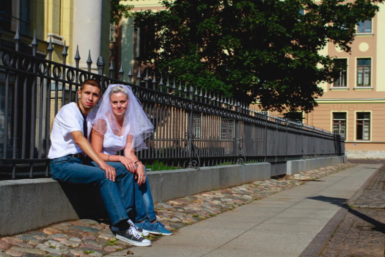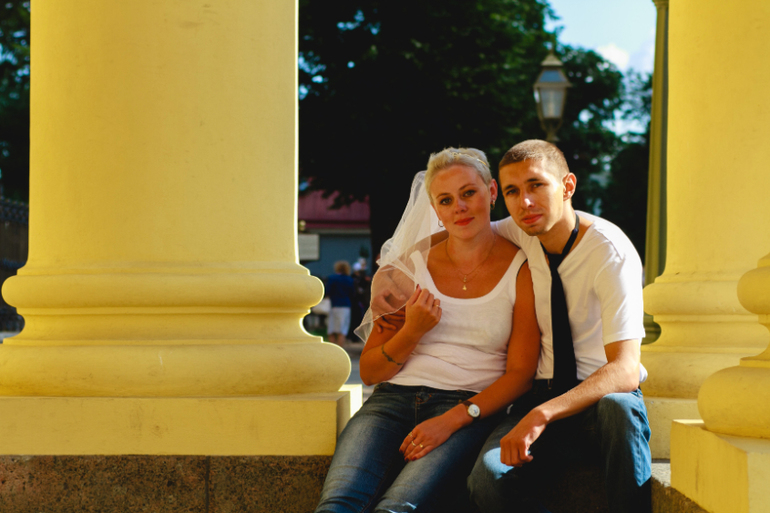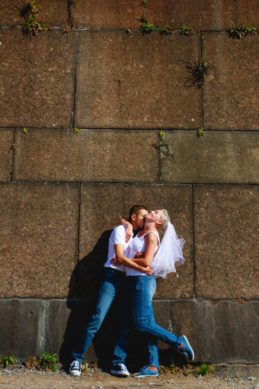 Блин, впечатления незабываемые!!! Просто море позитива!!! Мало того, что по-любому девушка в фате ловит на себе сотни взглядов (обожаю быть в центре внимания!), так еще надо было видеть лица окружающих и, особенно, туристов!!! Они ведь думали, что у нас на самом деле свадьба!!! В джинсах, кедах, но с фатой и галстуком!)) Ну а что? Шампанское, бокалы, фата, фотограф вокруг прыгает))) Свадьба!