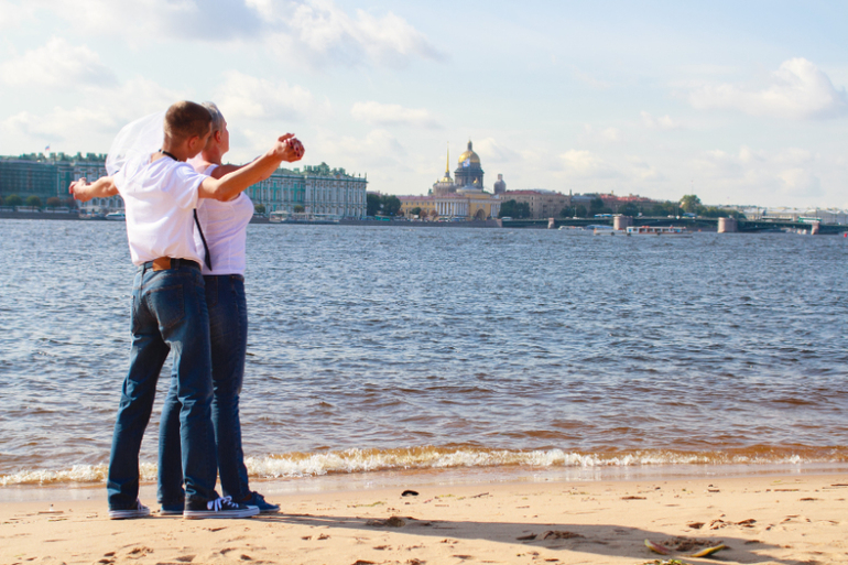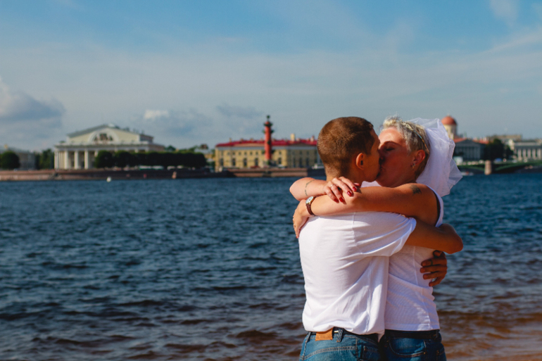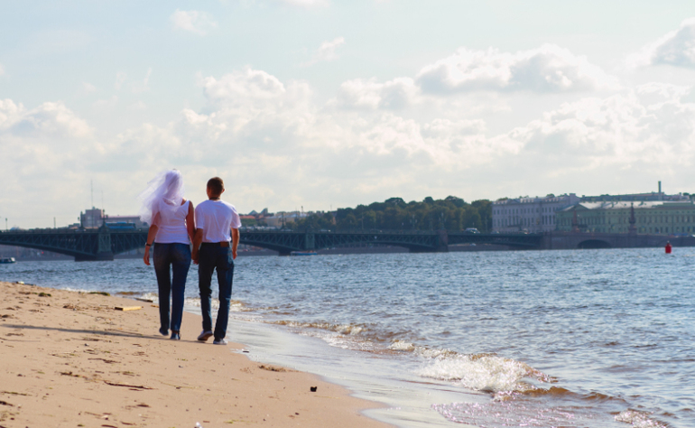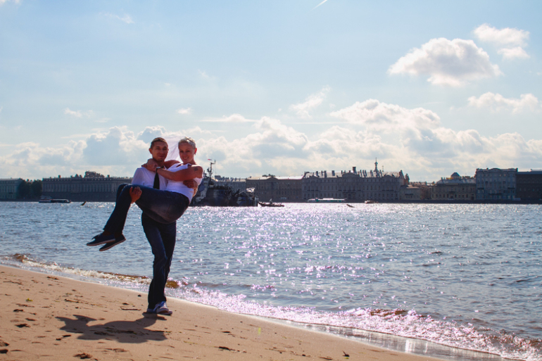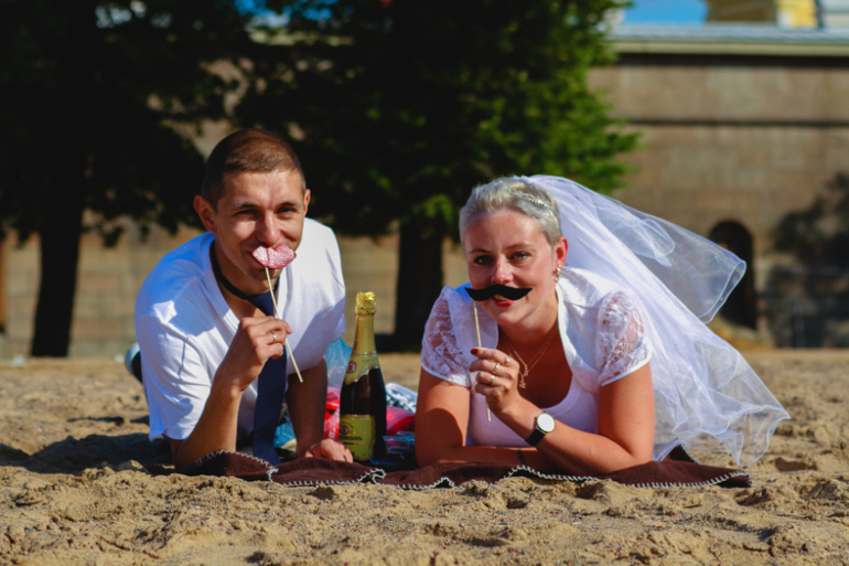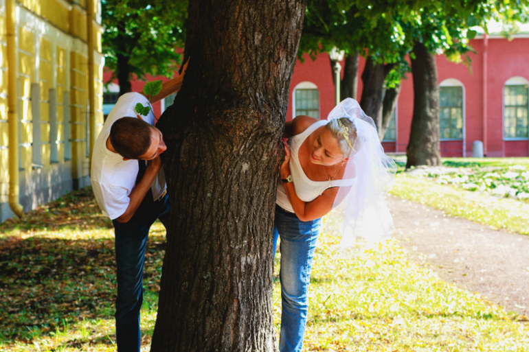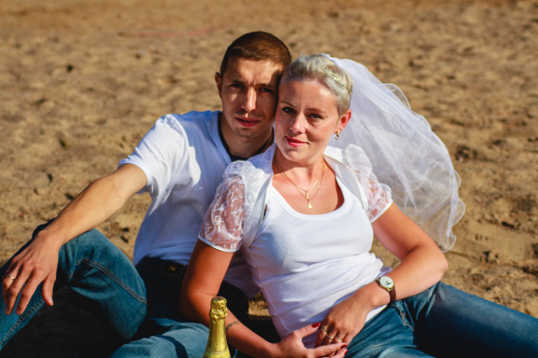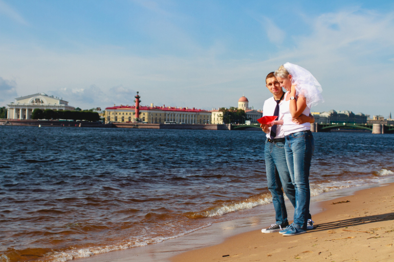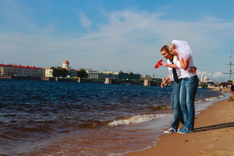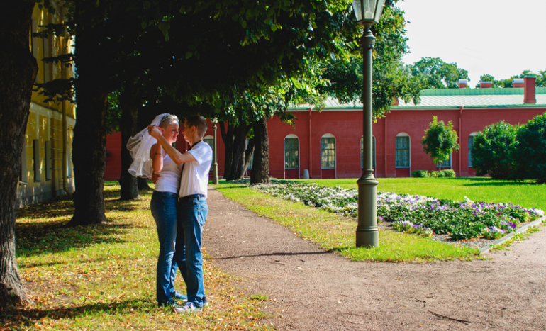 Блин, впечатления незабываемые!!! Просто море позитива!!! Мало того, что по-любому девушка в фате ловит на себе сотни взглядов (обожаю быть в центре внимания!), так еще надо было видеть лица окружающих и, особенно, туристов!!! Они ведь думали, что у нас на самом деле свадьба!!! В джинсах, кедах, но с фатой и галстуком!)) Ну а что? Шампанское, бокалы, фата, фотограф вокруг прыгает))) Свадьба!