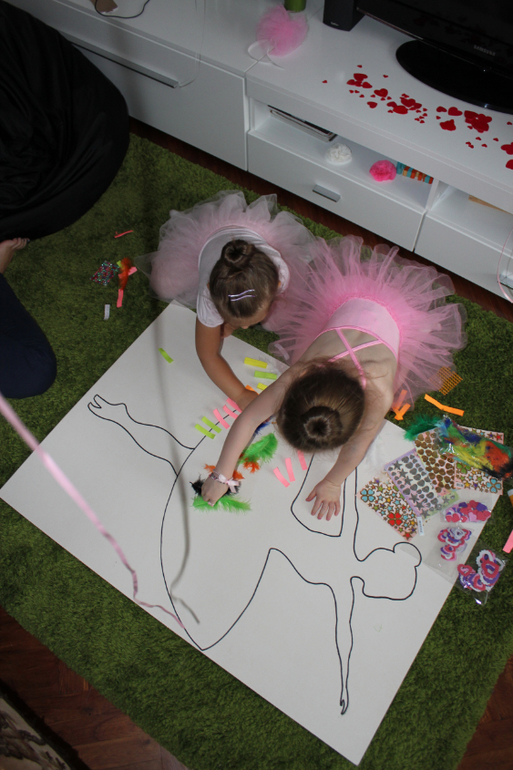 Для девочек я приготовила маленькие задания! Нужно было украсить платье балерины перьями, наклейками, блестками!