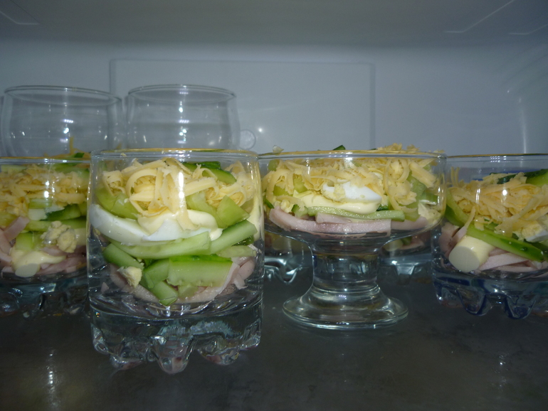 3. Уложите в фужер слоями, поливая каждый слой майонезом, в следующем порядке: ветчина, огурцы, яйца, перец, сыр.