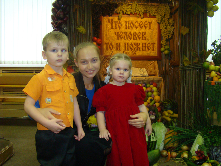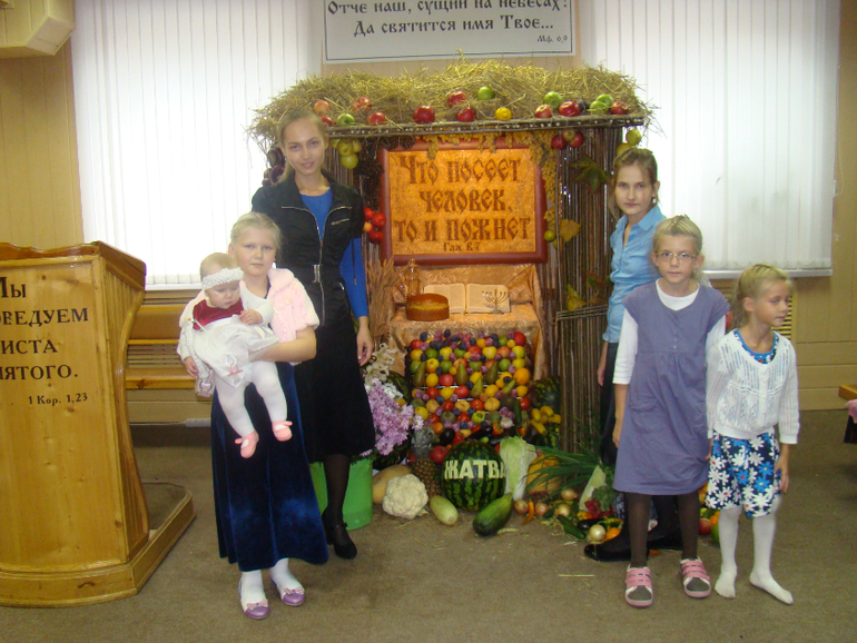 С Праздником!!!Сегодня у нас в церкви праздник Жатвы. Собрали много плодов фрукты, овощи, выпечка за все это благодарили Бога что посылал нам круглый год . Построили такую сцену из плодов. Очень хорошо прошел праздник, все довольны и счастливы.....