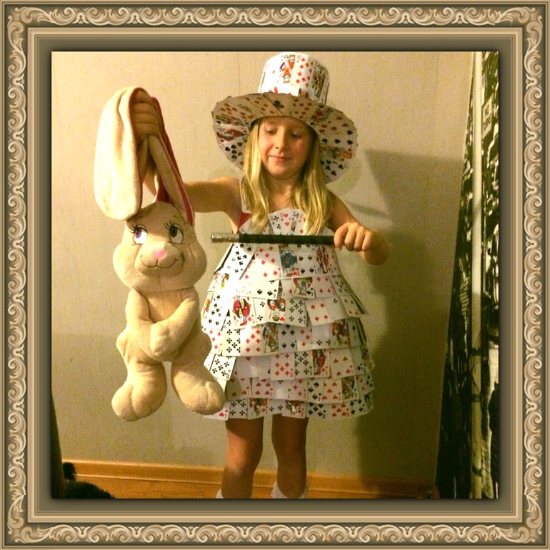 Праздник в школе и садуЗадали нам в садике задание сделать костюм из подручных средств для показа мод. Долго я думала, чтобы такое придумать... ну, чтобы не как у всех. И пришла идея использовать игральные карты, тк их у меня осталось много после вечеринки в стиле "мафия". В итоге из всех участвующих в показе, только у Анечки был карточный костюм... мы довольны))))