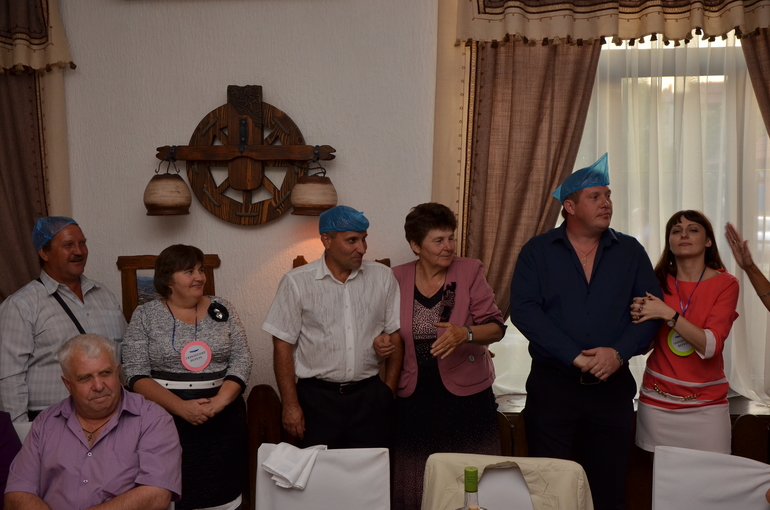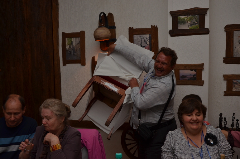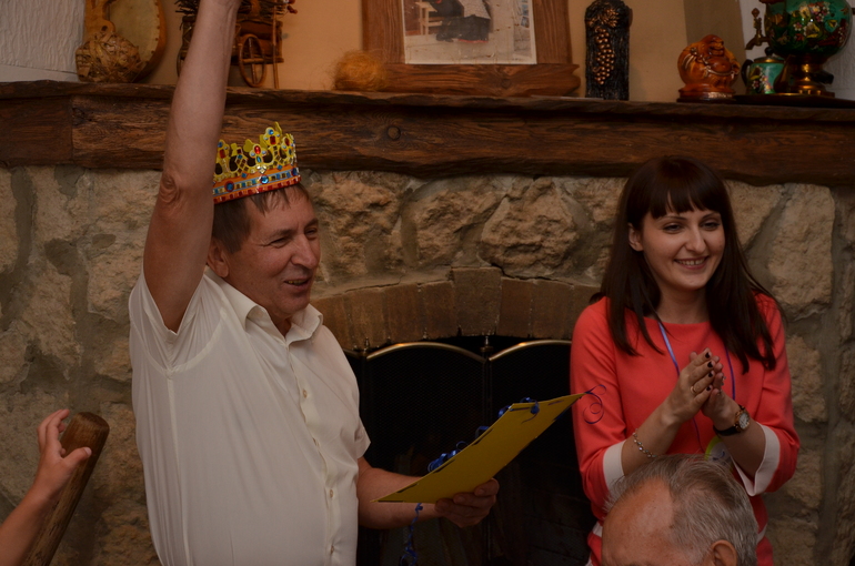 Вручает юбиляру бутылку шампанского и просит его открыть ее с хлопком и наполнить бокалы гостей.