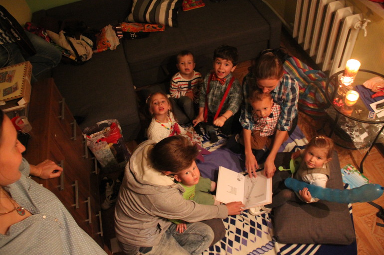 К вечеру переместились в дом, где был «Каравай», торт, свободное беснование Жуков))) Они до того разошлись, что нужно было срочно что-то придумывать. В маленькой комнате создали срочно атмосферу: плед, свечи, сообщили детям, что там их ждёт Сказка. Прочитали книгу, очень здорово прошло.