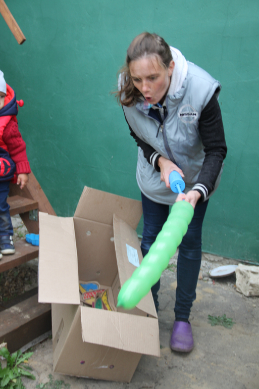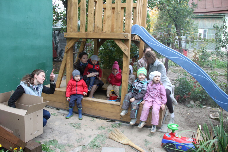 Из упаковки от ослика были сделаны крылья Жука! Каждому ребёнку предлагалось надеть крылышки, пошуршать ими, взлететь, прилететь к кустику, где жучков заставала ночь (накрывали тёмной тканью), потом будило солнышко (фонарик), начинался дождик (пуливелизатор) и надо было опять лететь к маме.