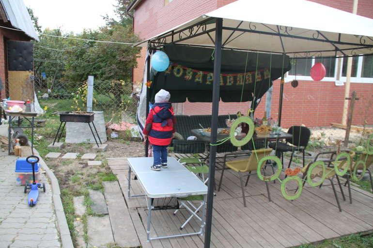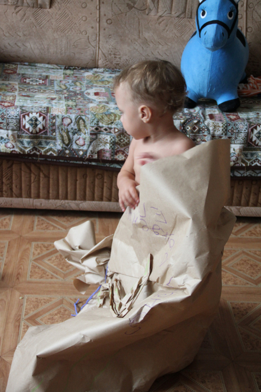 В качестве подарка папа смастерил для сына детскую площадку на участке, работал половину лета в свободные вечера, времени было немного, поэтому готово было как раз к ДР. Мне хотелось, чтоб было ощущение необычного дня, подарка, поэтому решено было купить резинового ослика, который однажды приглянулся Егору и он прыгал на нём всё время, пока мы были в магазине. Накануне вечером, после того, как ребёнок уснул, я упаковала ослика в крафтовую бумагу.