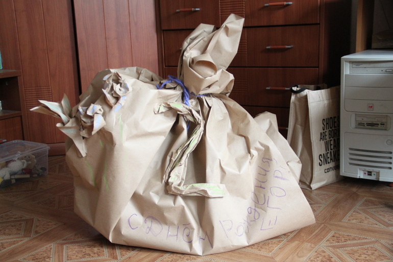 На утро был вручён подарок. Ослик был милым, но его опции были несравнимы с упаковкой! Это был и дом, и пещера, и крылья бабочки… Можно было просто подарить рулон крафт-бумаги… К тому же, ослик оказался сдувающимся, а чек потерялся.
