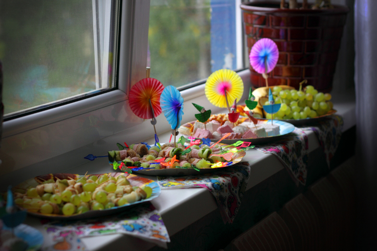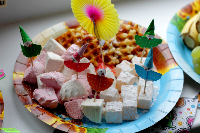 С первым ребенком отмечали годовасие в развлекательном центре! Очень понравилось и самой и детям, но многим родителям не очень понравилось т.к им хотелось продолжения посидеть, поболтать, выпить пришлось еще и дома все это продолжать. По этому у Яночки решили сразу дома отметить тем более гостей взрослых намечалось очень много.Много фото!Детям приготовила соки в упаковках,повозиться пришлось с канапе делала 2 вида: первое хлеб, колбаса,огурец на большой шприц насаживаешь , впереди носик отрезаете, делать легко но рассчитывала на 8 детей хотя бы по 2-3 шт, и 2 банан,груша, виноград, ну и всякие сладости, фрукты накрыла все на подоконике в спальне,так дети были возраста от 3-6 ,