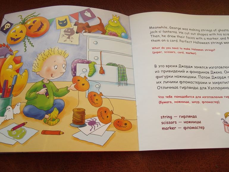 1.Конечно нужно привлечь детей к украшению дома.Это будут гирлянды из бумажных тыковок.Паутина на окне нарисованная акварелью,ну и паучок.У нас такой.