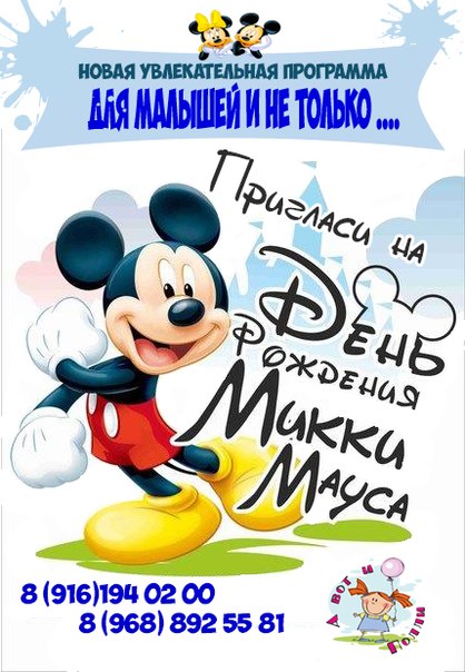 Студия детского праздника представляет Вашему вниманию новую увлекательную программу "Микки и Минни Маус у вас в гостях". В программе весёлые игры, зажигательные танцы, яркий реквизит и подарок от Микки для всех участников