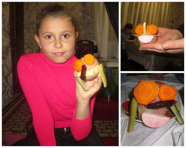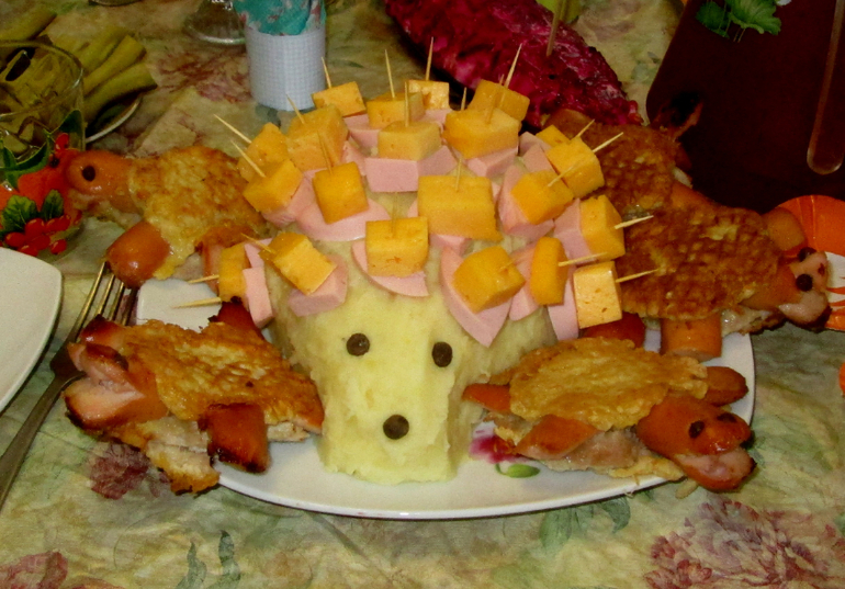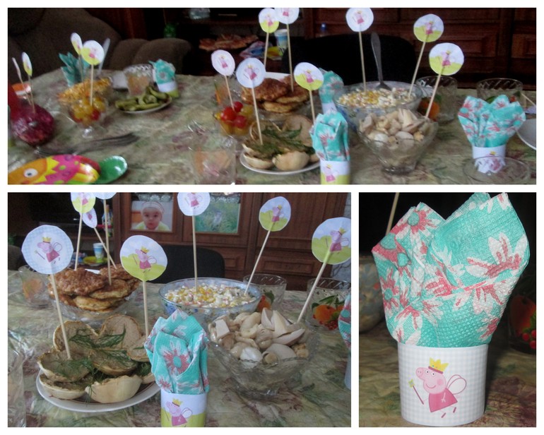 Стол. Да не готовила особо ничего. Пашка совсем из колеи выбил. По другому все планировала, детям большой сладкий стол. А тут у именинника неделя жесткой диеты, итак на празднике позволила непозволительно много лишнего ему съесть. Короче, не фотографировала особо стол. Так, шпажки натыкала везде.