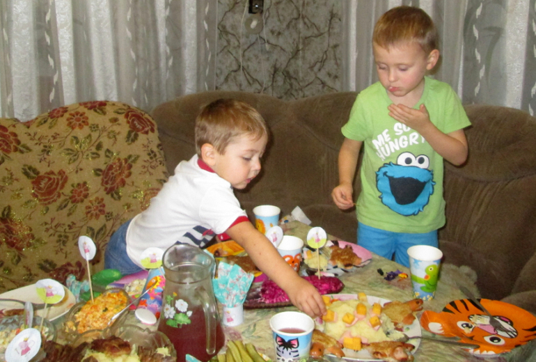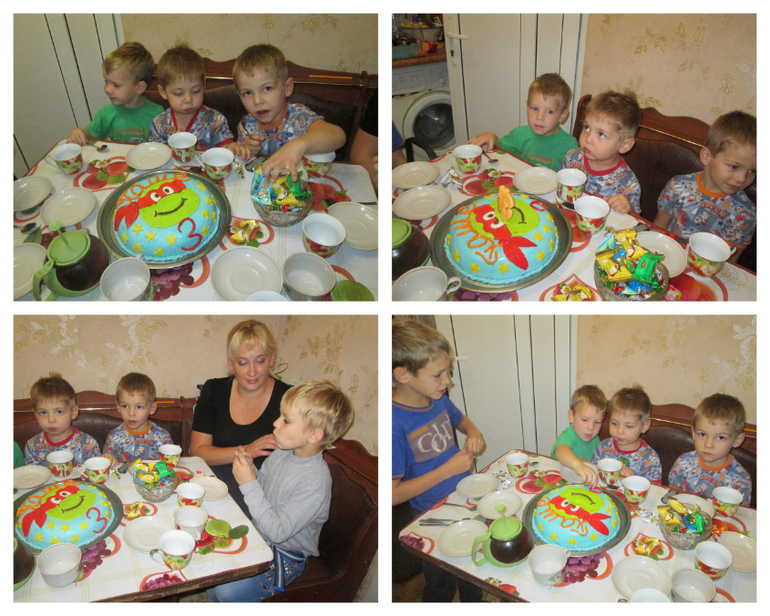 День Рождения нашего младшенького выпадал на будний день, поэтому в этот день сходили с детьми на аттракционы, а вечером просто попили чай с соседской детворой. Празднование решили перенести на выходные.