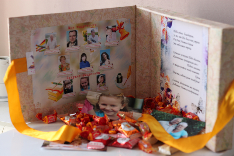 А внутри сделала коллаж. Бабушкины дети и внуки - ее выпускники. А правнучки - будущие выпускницы. Т.к. в школе учится только старшая правнучка..